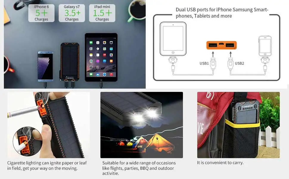 - Dual USB Ports: Two USB output can charge two devices at the same time, also compatible with most 5V USB-Charged devices such as iPhone, Kindles, Gopro Camera, GPS and Bluetooth Speaker.